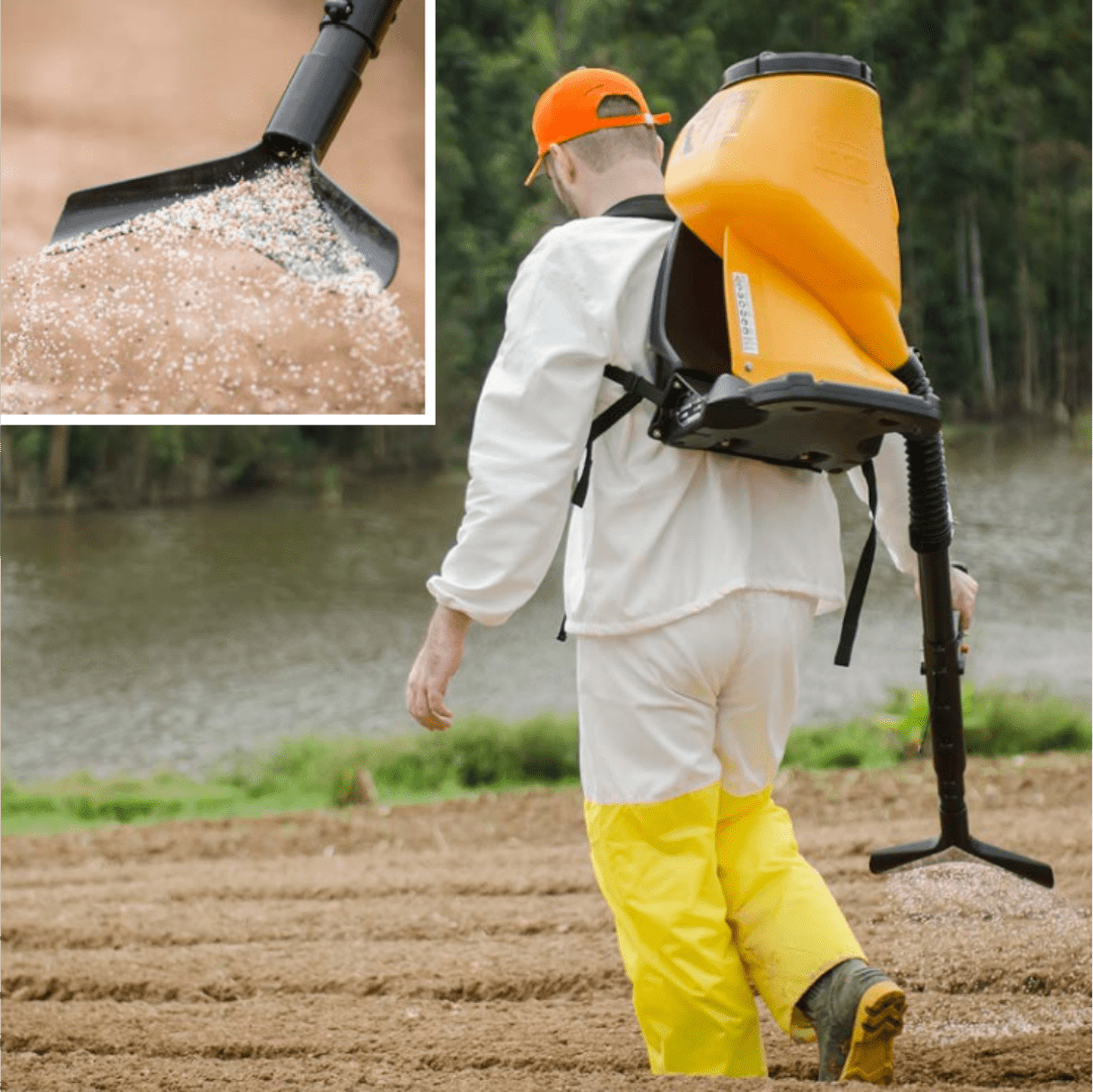 - Equipamento para aplicação manual de produtos granulados, tais como: fertilizantes (ureia, N-P-K, entre outros), inseticidas (iscas formicidas) e nematicidas;